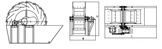 洗砂機(jī)工作時(shí),電機(jī)通過三角帶、減速機(jī)、齒輪減速后帶動(dòng)葉輪緩慢轉(zhuǎn)動(dòng),砂石有給料槽進(jìn)入洗槽中,在葉輪的帶動(dòng)下翻滾,并互相研磨,除去覆蓋砂石表面的雜質(zhì),同時(shí)破壞包覆砂粒的水汽層,以利于脫水;同時(shí)加水,形成強(qiáng)大水流,及時(shí)將雜質(zhì)及比重小的異物帶走,并從溢出口洗槽排出,完成清洗作用。干凈的砂石由葉片帶走,后砂石從旋轉(zhuǎn)的葉輪倒入出料槽,完成砂石的清洗作用.